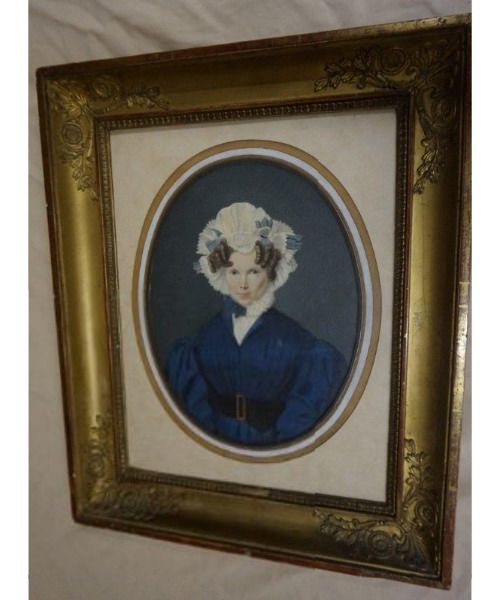 | Portrait de femme coiffée de boucles à l'anglaise sous un bonnet de batiste | |