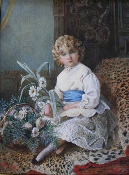 A CHILD WITH A BASKET OF FLOWERS, SEATED UPON A LEOPARDSKIN RUG