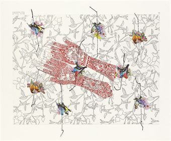 | Silkscreen etching, embroidery and printed paper collage on paper | |