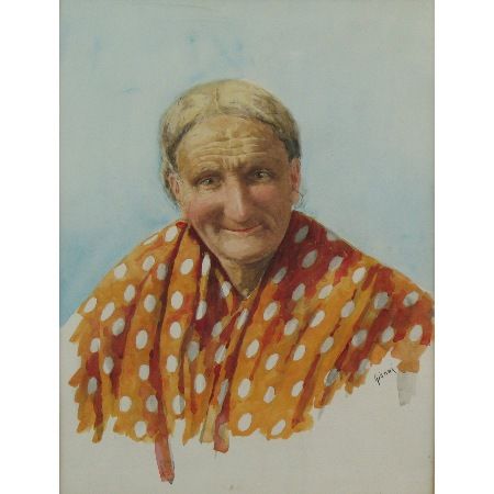 portrait on an elderly man and lady, he with beard wearing an orange hat, she wearing an orange and polka dot shawl