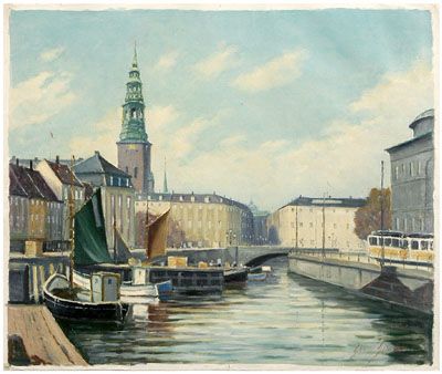 | canal with boats, trolley, distant church spire, figures on bridge and dock | |