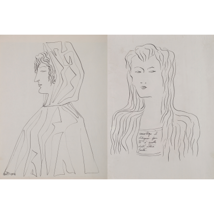 | A double-sided drawing depicting an hooded feminine profile and a feminine face | |