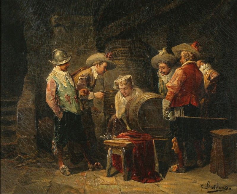 Some Musketeers and a young girl in a wine cellar, filling the wine