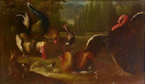 | A turkey, peacock and cockerels with a rabbit in a landscape | |