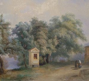 Travellers by a roadside shrine