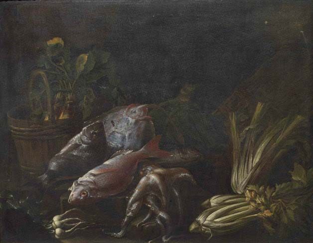 NATURA MORTA CON PESCI, ORTAGGI E CESTA DI VIMINI