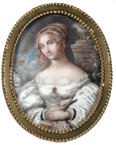 | Portrait miniature of a lady of the Duffield family wearing a white dress, gold brooch set with blue gem and three pendant pearl | |