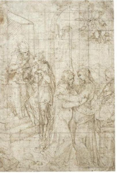 | Pen and brown ink over black chalk, squared in black chalk | |