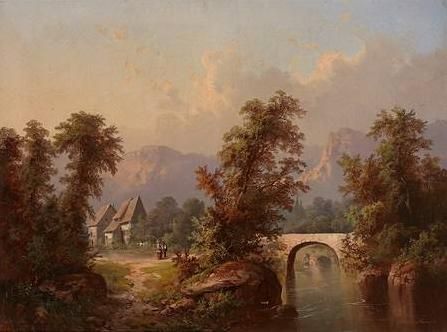 | Sommerliche Landschaft mit Flusslauf und steinerner Brücke, Häusern und Figurenstaffage vor Gebirgshorizont | |