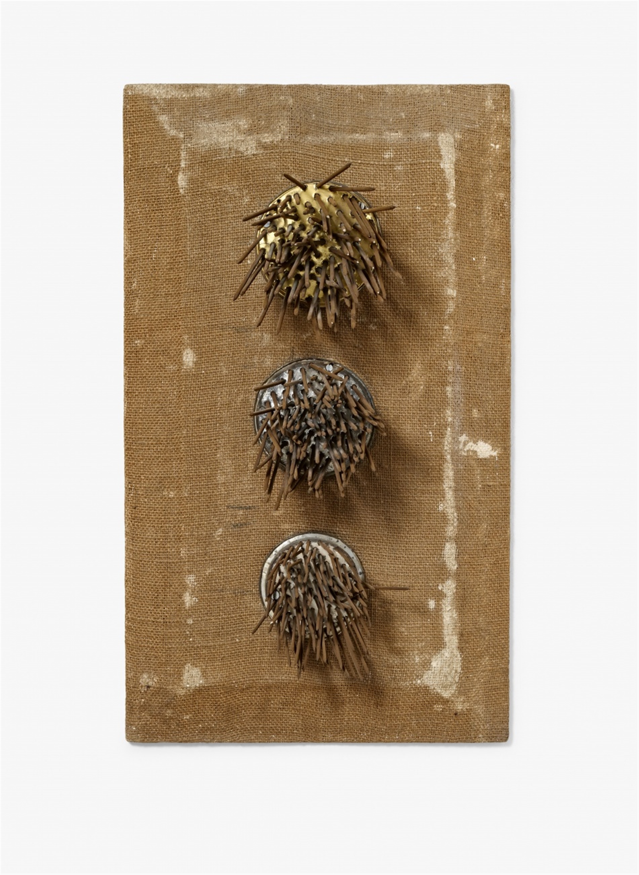 Unknown Nails on 3 tin lids on canvas on wood