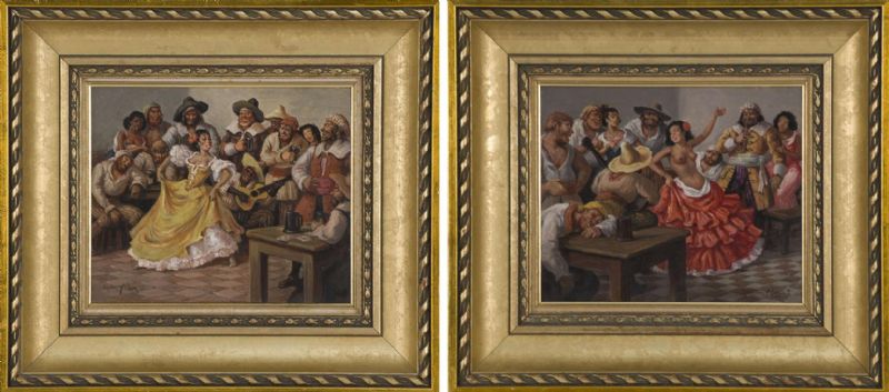 | Pair of interior scenes depicting groups of pirates being entertained by scantily clad Spanish dancers | |