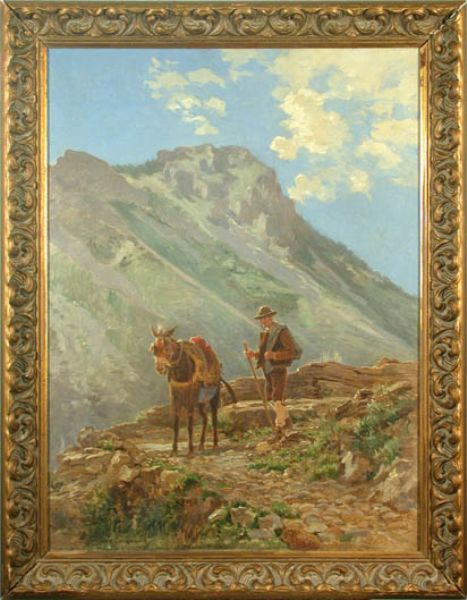 Weite Gebirgslandschaft, im Vordergrund ein Hirte mit seinem Maultier