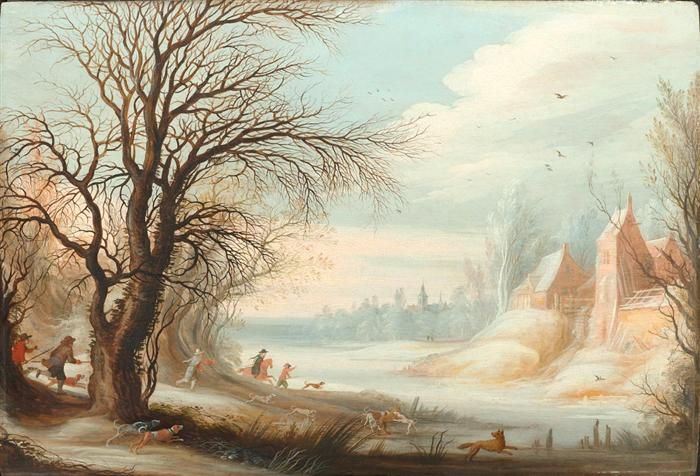 Winterlandschaft mit Jägern bei der Fuchsjagd.