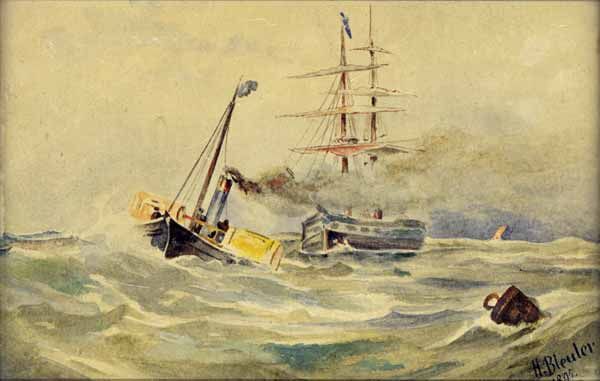 Dampfer u. Segelschiff auf bewegter See.
