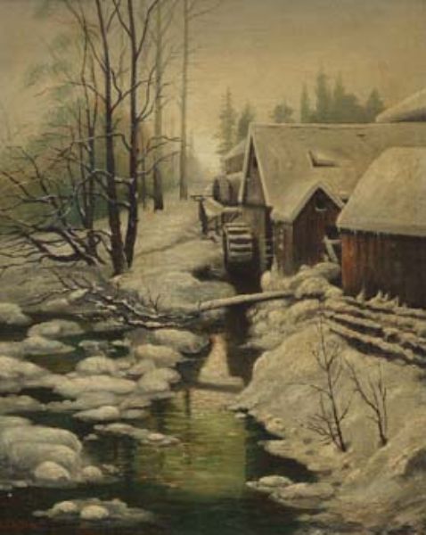Winter scenes with watermill and woodland
