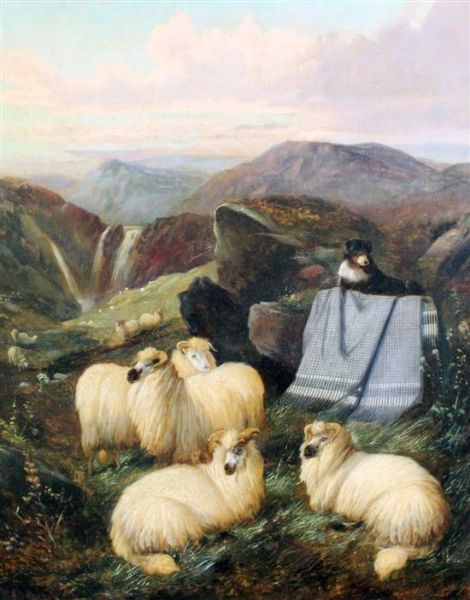 Sheep dog and flock in the highlands