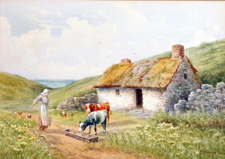 Milk Maid with Calves by a Derelict Cottage, distant view of Sea