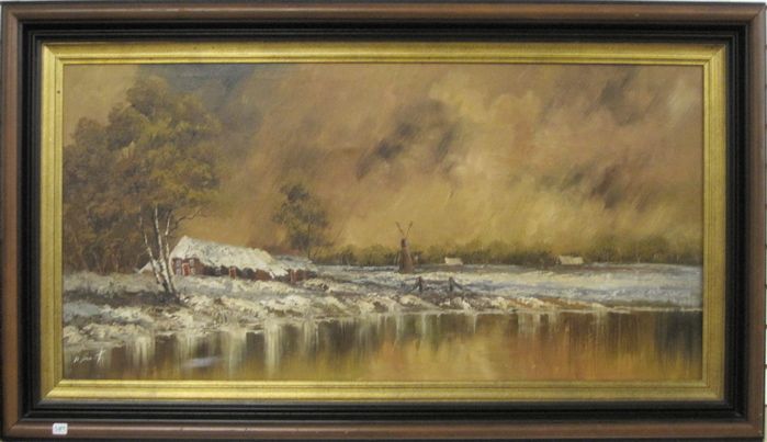 | Snow covered winter landscape with a farm house and body of water in the foreground | |