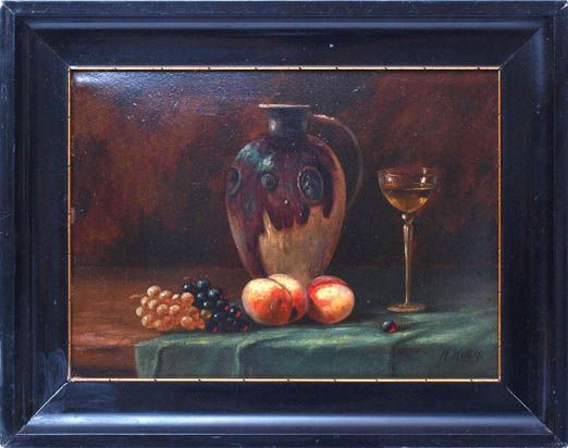 Stilleben mit Krug, Weinglas und Früchten auf einem grünen Tuch