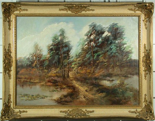 Fahrweg durch ein baum- und buschbestandenes Moor unter sommerblauem Himmel
