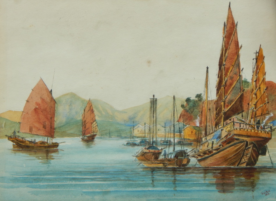 Fishing smacks in coastal scene