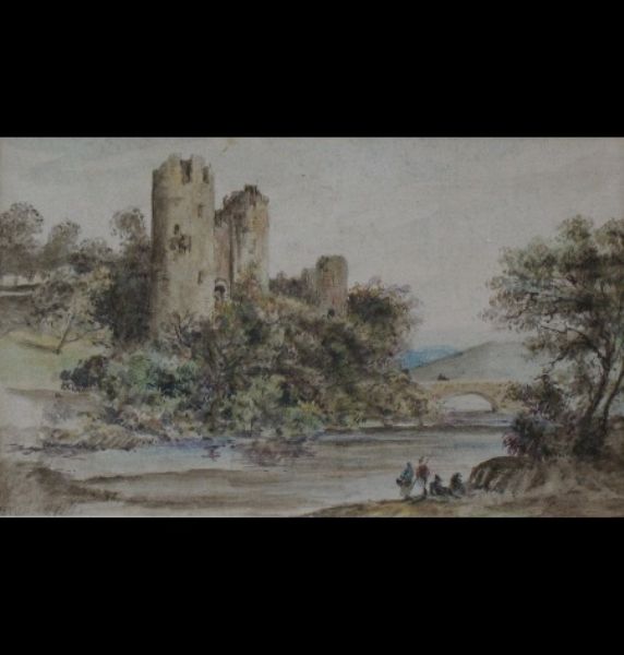| river landscape with figures in the foreground, ruined castle on the opposite bank and a bridge in the distance | |