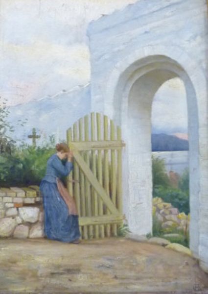 Woman mourning at the cemetery gates