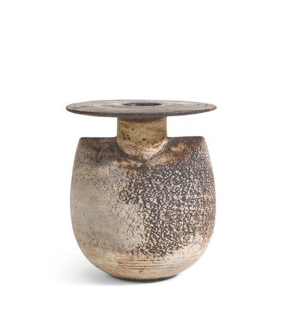 | Stone stoneware, layered white porcelain slips and engobes over a body with textured and incised linear designs and manganese glaze to flaring disc | |