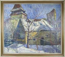 Kirchenburg Weidenbach an einem sonnigen Wintertag. Im Vordergrund das alte Pfarrhaus