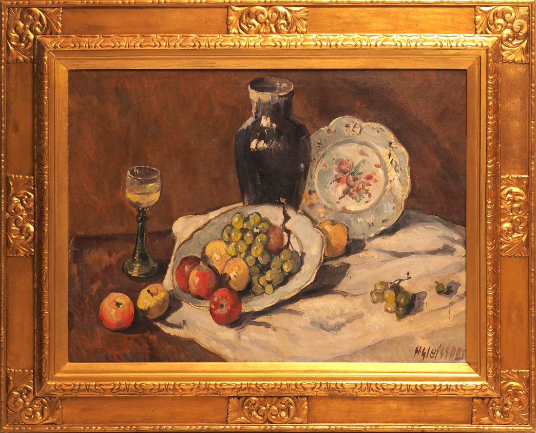 | Still life with wine glass, fruits, vase and porcelain plate. | |