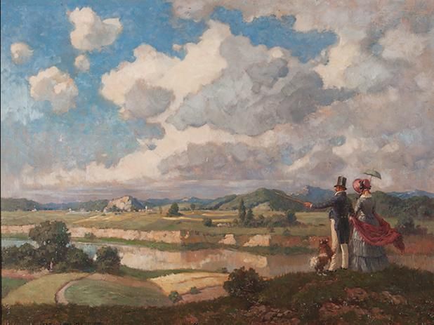 Weite Landschaft mit elegantem Paar und Hund