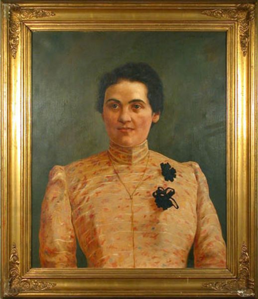 | Brustbild einer den Betrachter anblickenden jungen Frau mit hochgestecktem, dunklem Haar. | |