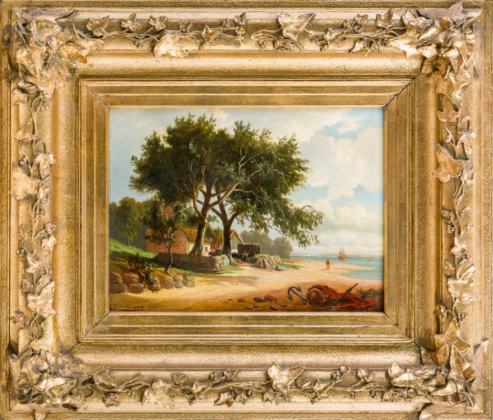 Norddeutsche Flusslandschaft mit Bauerngehöft unter Bäumen an breiter Bucht