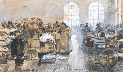 | Fischhalle in Amsterdam. Zahlreiche Fischhändler und Käuferinnen | |