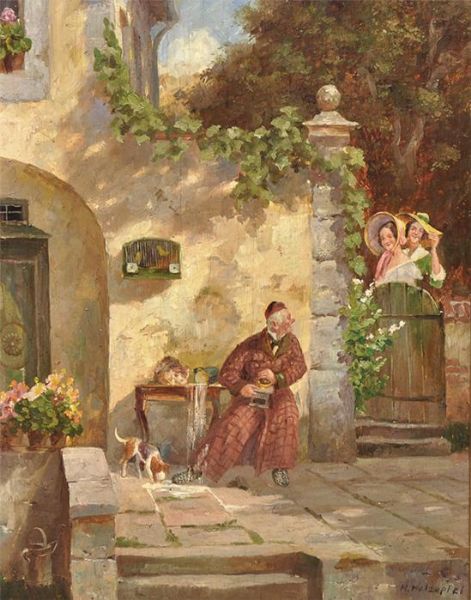 | Zwei Damen, über Gartentor hinweg den dahinter sitzenden Herrn im Schlafrock grüßend. | |