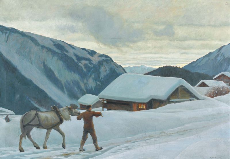 Winterlicher Sonnenaufgang mit Bauer und Pferd im Gebirge.