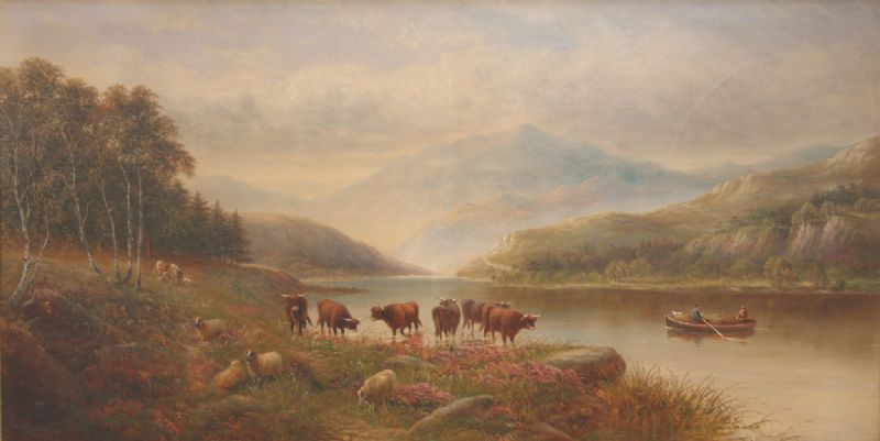 Highland Landscape with Cattle, Sheep and Horse on the Bank of Loch near Figures in a Rowing Boat