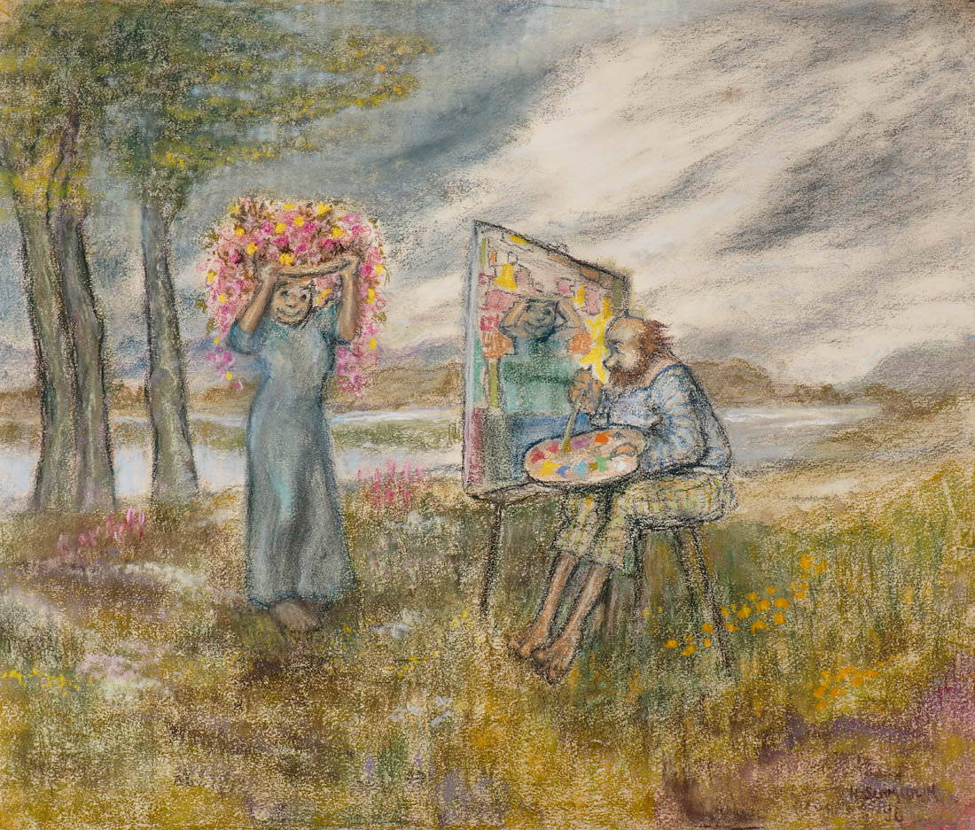 Cartoon. Painter with model in free nature