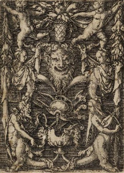 Ornament mit Satyrpaar, Kindern und Trophäe