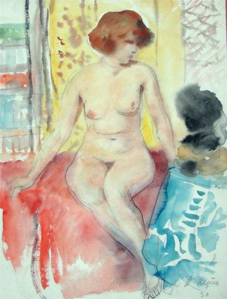 Auf Sofa sitzender Frauenakt.