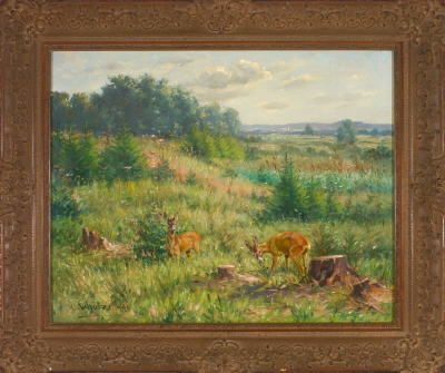 Rehbock und Ricke am Waldrand vor weiter Landschaft