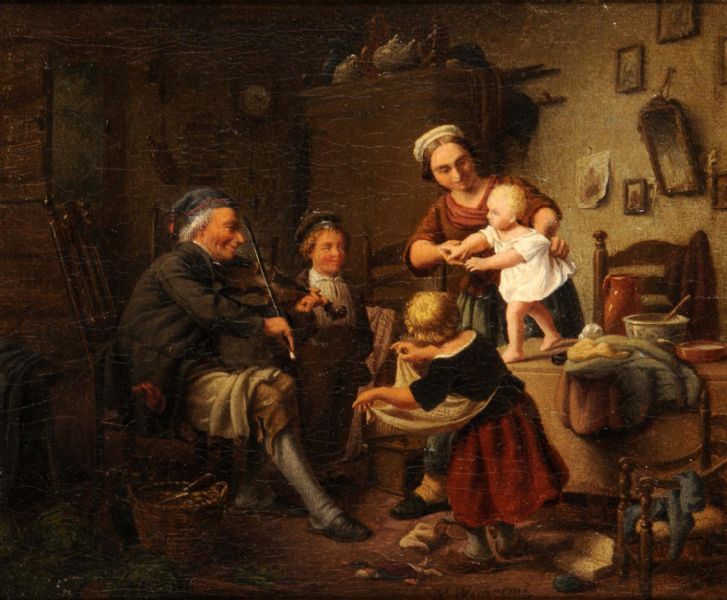 | interior genre scene with young family playing and dancing to music of a violin | |