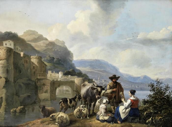 | An Italianate landscape with a shepherd and his flock on the banks of a river, a walled town in the distance | |