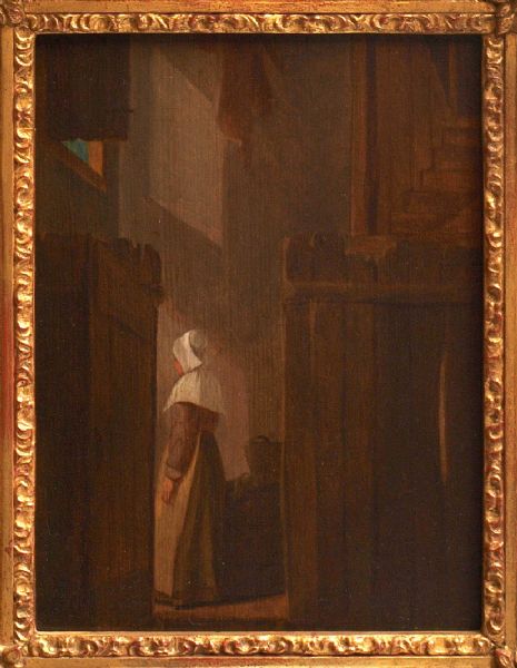 | Hinter einer halb geöffneten Brettertüre steht eine Magd in einem Raum, der durch ein oben liegendes Fenster erhellt wird. | |