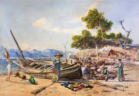 | French, A Continental lake scene with figures unloading boats, other figures under canvas and boy carrying amphora | |