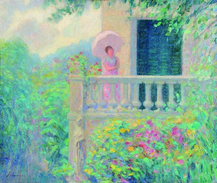 Femme à l’ombrelle sur une terrasse dans le Midi vers 1923