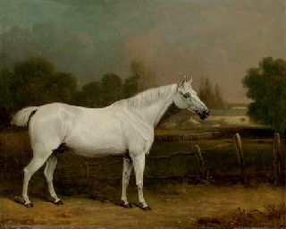 A Grey Hunter in a Landscape and a Farmhouse beyond