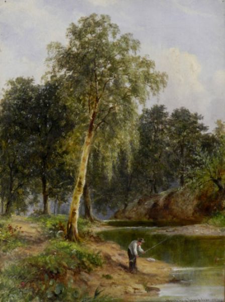 An angler in a wooded river landscape