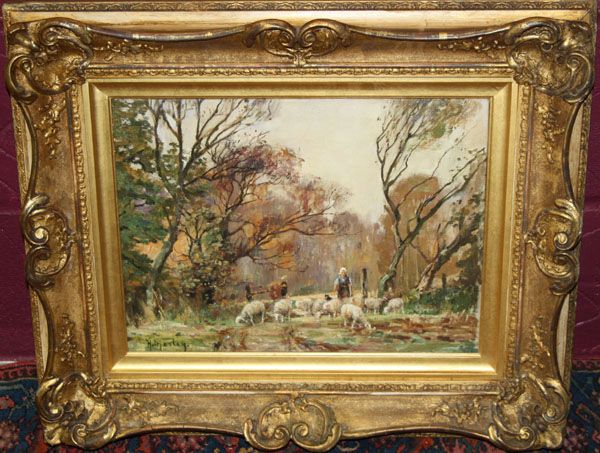 wooded landscape with a shepherd and sheep in foreground