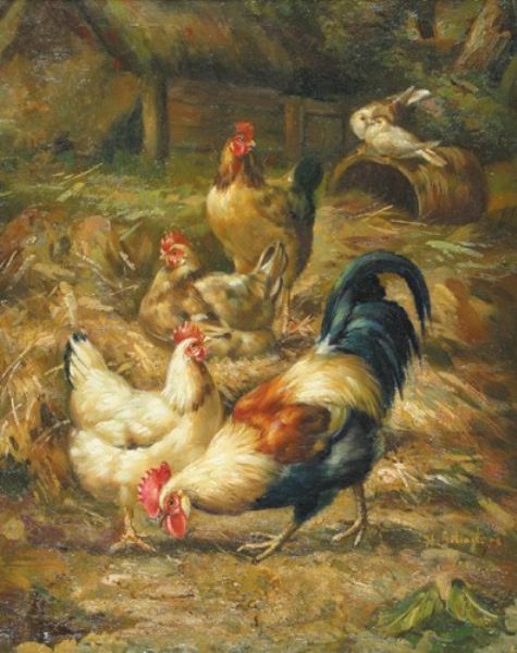 Hofje met enkele scharrelkippen, op de achtergrond twee duiven